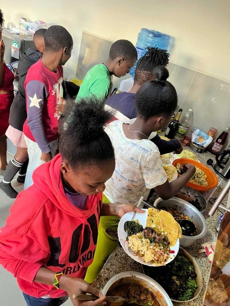 Jeg tilberedte en række forskellige retter, hvoraf en af dem var de lækre gulerods-chapatis. (Østafrikanske pandekager) Lærke var så glad for dem, at hun bad om en opskrift. De fleste afrikanere bruger ikke opskrifter. Jeg er som de fleste afrikanere. Jeg var taknemmelig for den hjælp, jeg fik fra Umoja Calabash-truppen. “Selvbetjening!” Morten råbte. Der var straks en kø. Glad snak, glødende øjne, savlende munde og små dansefester fra dem, der allerede havde tjent.